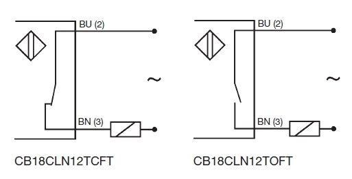 ATEX approved capacitive sensors in ø18 thermoplastic body with adjustable (potentiometer) sensing range of 3 - 12 mm. The CB18CLN12T… are two-wire sensors with AC wide area power supply and output NO or NC (depending on model) and have fixed output ON-delay of 30 sec.