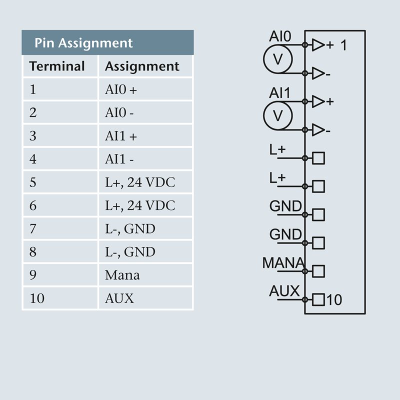 2 analog inputs for measuring voltage, electrically isolated from the backplane bus, 2 process input words