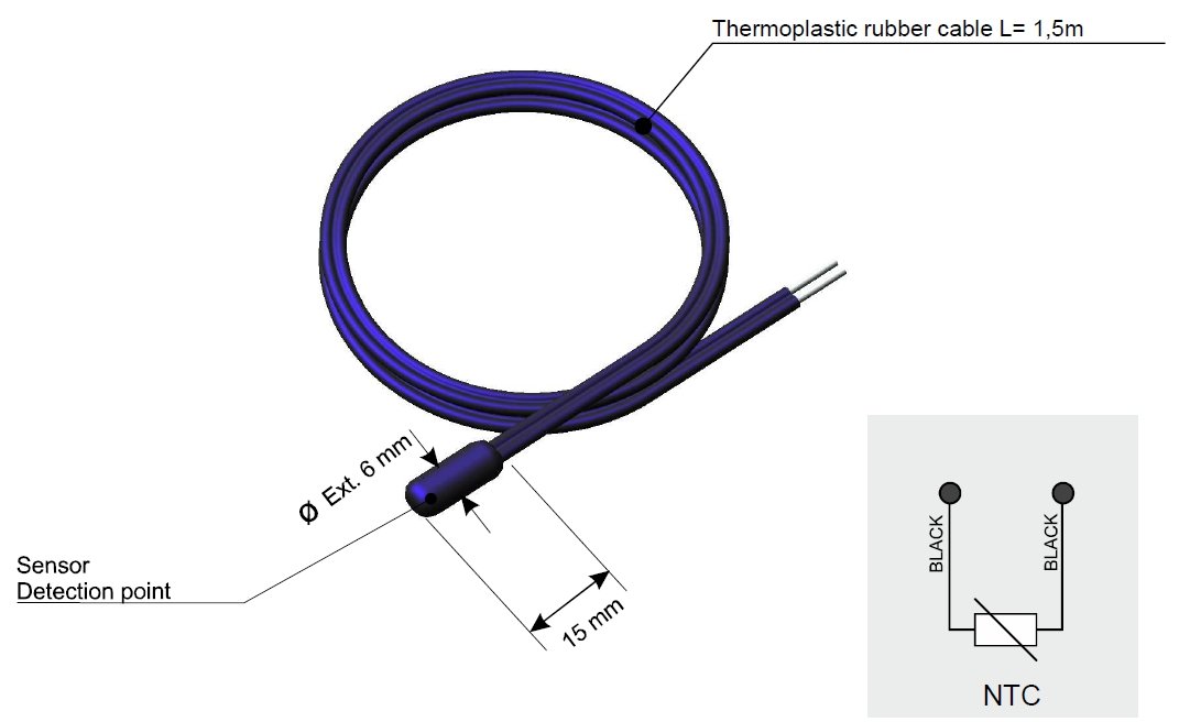 The NTC thermoresistors are used to measure temperature for refrigeration, air conditioning, and heating applications. They consist of a cable, a sensor, and a steel or resinated polypropylene capsule.