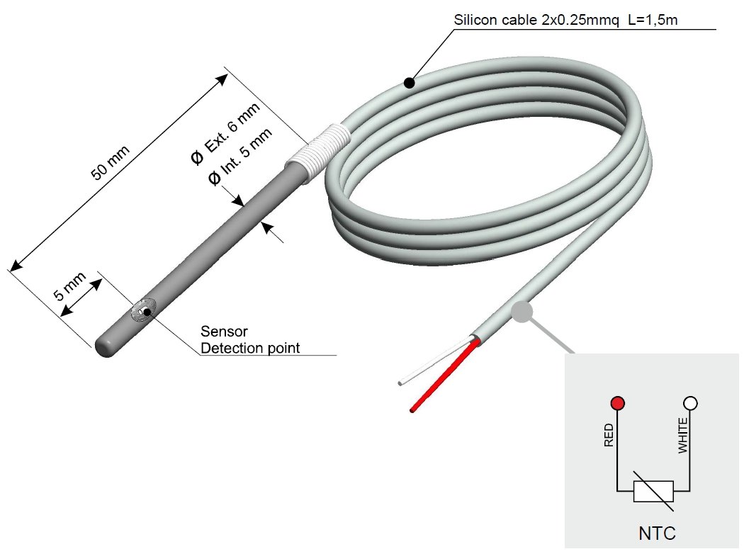 NTC 10K temperature probe, Ø=6 mm, with cable & EASY-UP code. (-40 ... +125°C). PIXSYS