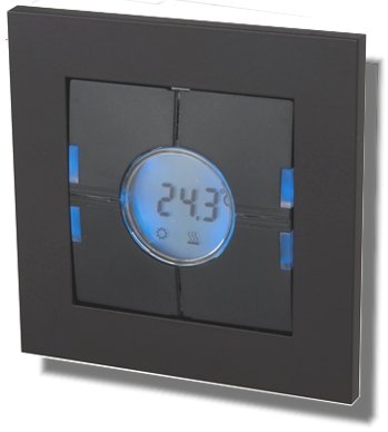 Temperature controller with display, 4 buttons and 4 LEDs. It is developed to be mounted into a 44x44mm and 55x55mm wall socket. The TEMDIS display can manage 6 automatic setpoints (3 for heating and 3 for cooling) and one manual setpoint to let the user manage in the most comfortable way the temperature in his home. Also shows current room temperature, floor temperature and outdoor temperature.