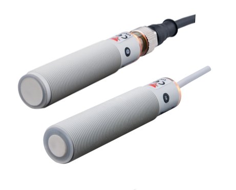 Ultrasonic sensors in M18 plastic body with sensing up to 40 cm or 90 cm or 2,2 m. There is microprocessor control of the digital filtering that makes the sensor immune to most electromagnetic interferences and the output is one analog (positive or negative slope) and one digital. On the body of the sensors there is a teaching button for the programming of function, outputs etc.