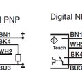 Ultrasonic sensors in M18 plastic body with sensing up to 30 cm or 80 cm. There is microprocessor control of the digital filtering that makes the sensor immune to most electromagnetic interferences and the output is one digital output with “window” detection with two set points. The adjustments are ‘’teach by wire’’.