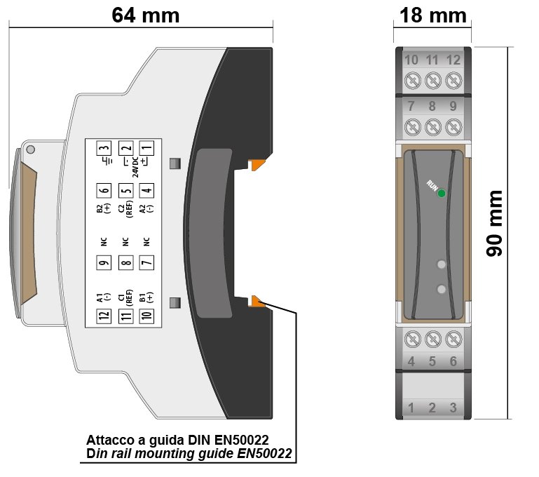 Its compact and DIN-rail mounted housing beside 24Vdc supply make NET485 the solution for any isolation issue of devices with non-isolated serial port RS485 like frequency inverters, sensors, PLCs.