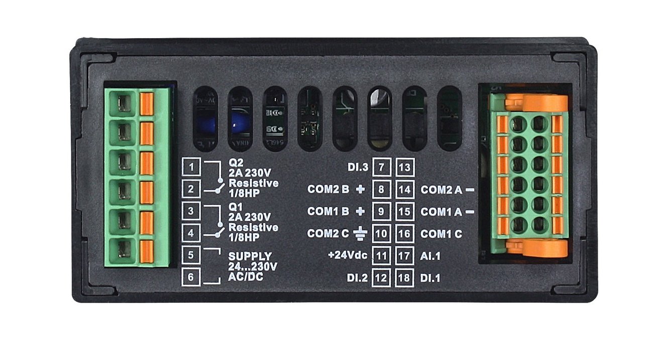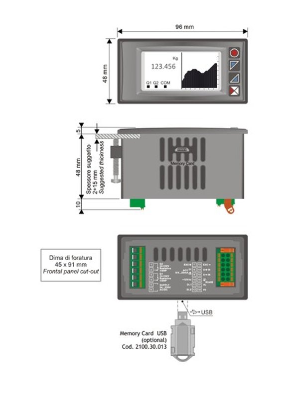 Digital inputs allow the connection of a rotative encoder that further simplifies navigation of the data displayed and the parameters, or connection to panel buttons with programmable functions. In addition to the galvanically isolated master serial port with Modbus RTU/ASCII protocol, a second slave serial port enables polling from another Master device.