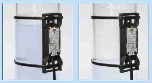 The CD34.. capacitive sensor is capable of detecting liquids through plastic walls of 0.5 to 6 mm and glass walls of 0.5 to 4 mm, and, moreover, it adapts automatically to changing wall thicknesses.