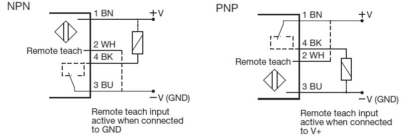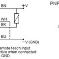 Reinforced PMMA/ABS housing (10 x 30 x 20 mm) DC retro-reflective photoelectric sensors. There is a Teach-In button for adjustment the type of output and the sensitivity, but the user also can remote teach the settings of the photoelectric sensor via a cable (e.g. a PLC).