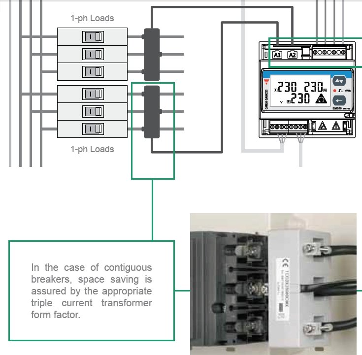 When dealing with mass production of switchboards, where a number of 3-phase loads are to be monitored with traditional energy meters, many wires normally have to be prepared and cabled, requiring long installation time and additional space.