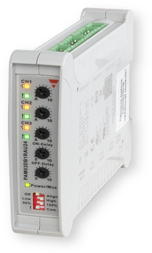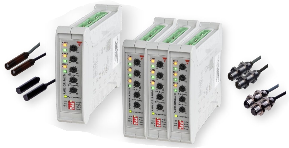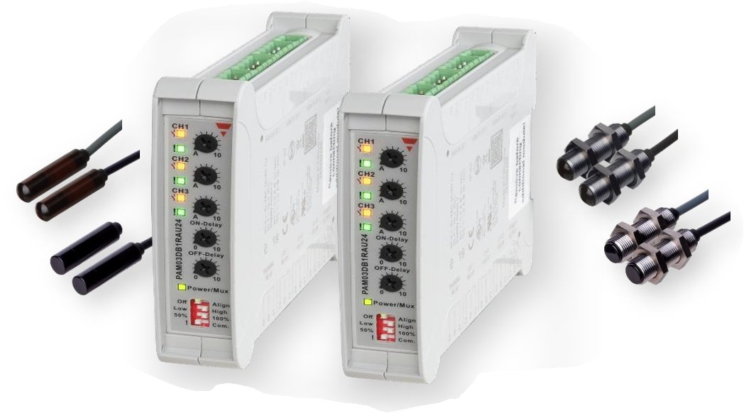 Amplifier units for 3 sets of photoelectric through-beam sensors MOF. (sensing range up to 50 m). Multiplex function for 30 optical sets. Carlo Gavazzi