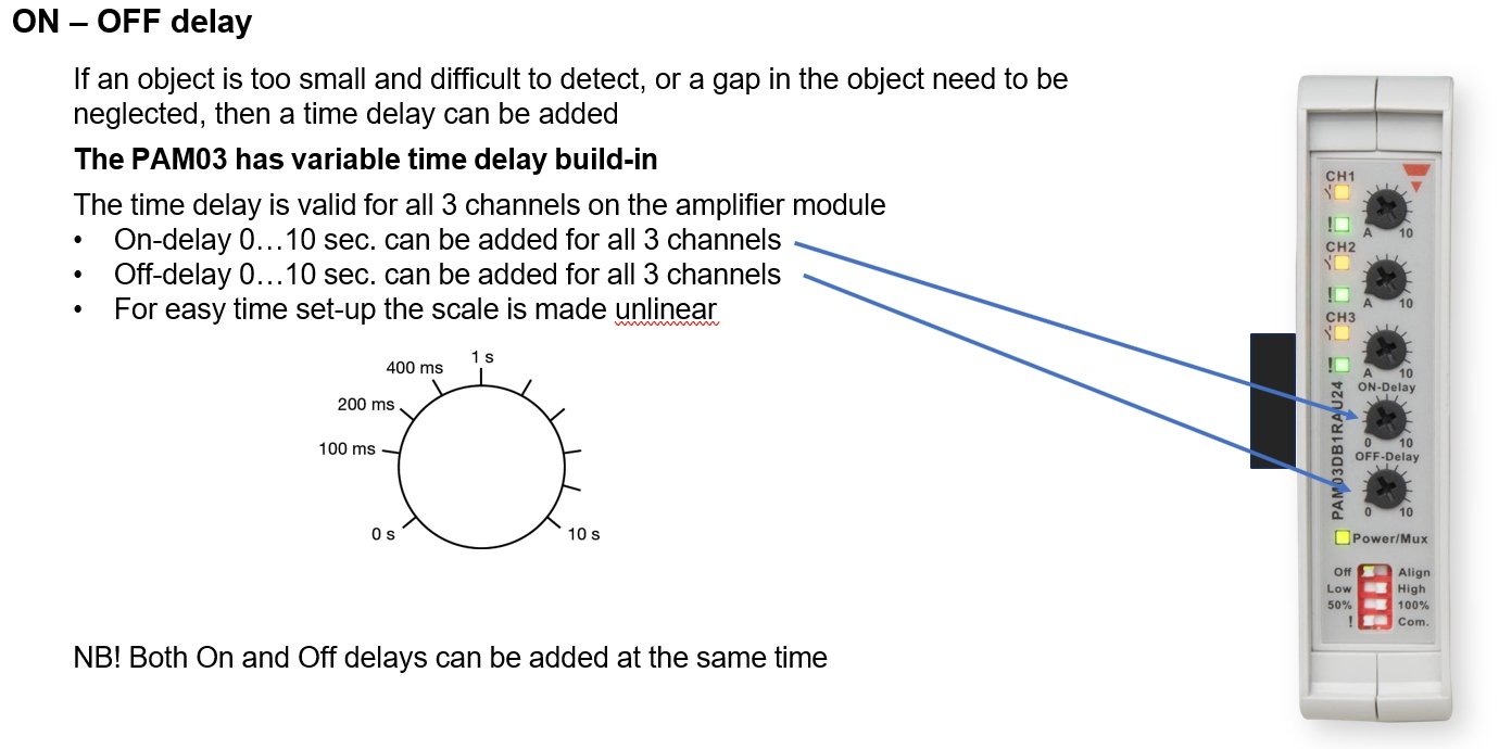The PAM03 amplifier operates as a standalone unit controlling three sets of MOF Series Sensors, or in networked configuration with up to ... ten amplifiers connected via the built-in communication port. The master/slave setup enables control of up to ... thirty MOF Sensor sets, with all connected sensors operating through multiplexing to eliminate crosstalk between units.