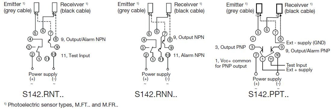 μ-Processor controlled amplifier for one set of photoelectric sensors (type MOFT/R), plug in 11-pin base. The S142 B…. have timers (delay-Off and delay-On), relay and NPN / PNP transistor output, diagnostics for sensors, test during operation, alignment help via LED or alternation of alarm output, level indication for dirt accumulation, manual or automatic emitter power regulation and two emitter codes for high neighbor immunity.