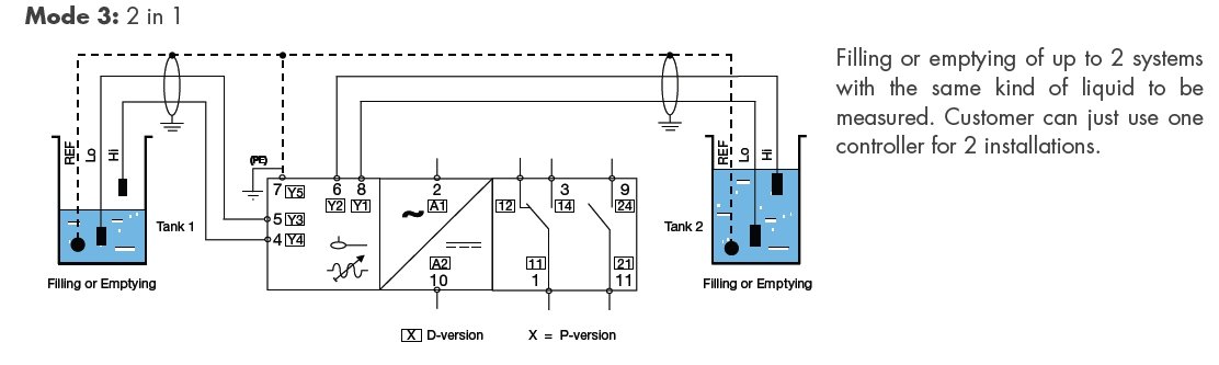 3 - Filling or emptying of up to 2 systems with the same kind of liquid to be measured. Customer can just use one controller for 2 installations