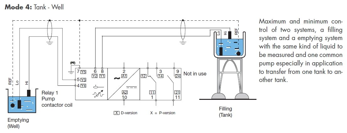 4 - Maximum and minimum control of two systems, a filling system and a emptying system with the same kind of liquid to be measured and one common pump especially in application to transfer from one tank to another tank