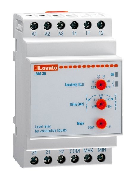 The Lovato Electric level control relay for conductive liquids, which provides the tank emptying or filling control, by rotating the MODE selector, by means of MIN and MAX (or only one) level electrodes. With the “Sensitivity” potentiometer, the adjustment of the relay sensitivity, between 2.5 and 50kΩ, is obtained.