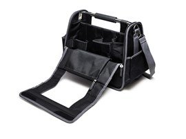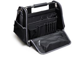 Practical tool bag in robust fabric, with 2 separate compartments to neatly arrange hand tools. Additional equipment may be accommodated via handy hooks and external pockets while documents are safely stored inside. A shoulder strap and sturdy metal handle make it easy to carry.