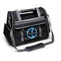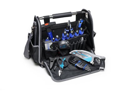 Practical tool bag in robust fabric, with 2 separate compartments to neatly arrange hand tools. Additional equipment may be accommodated via handy hooks and external pockets while documents are safely stored inside. A shoulder strap and sturdy metal handle make it easy to carry.