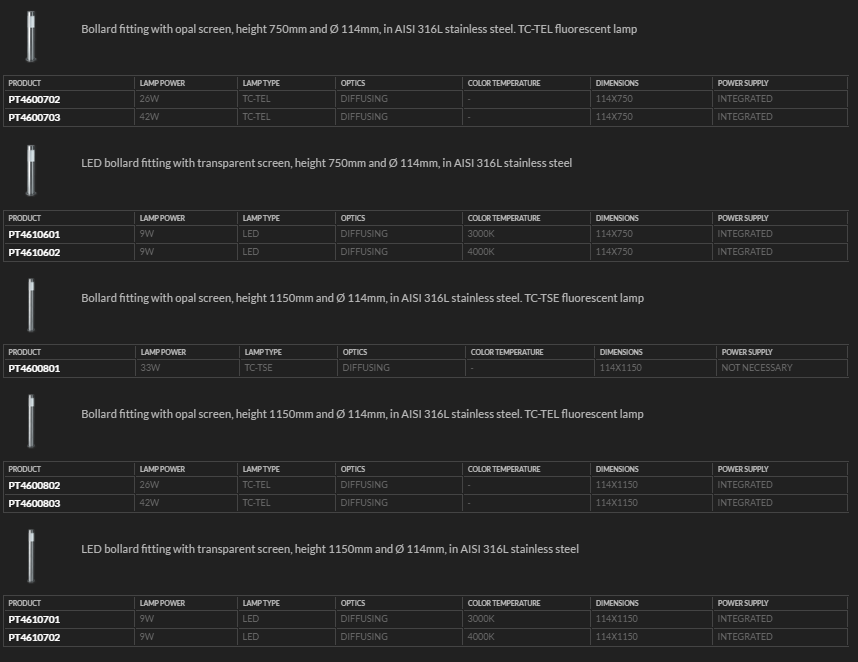 Bollard luminaires in stainless steel AISI 316L. With its minimal, evergreen design and its diffuse lighting it is ideal for gardens and parks.