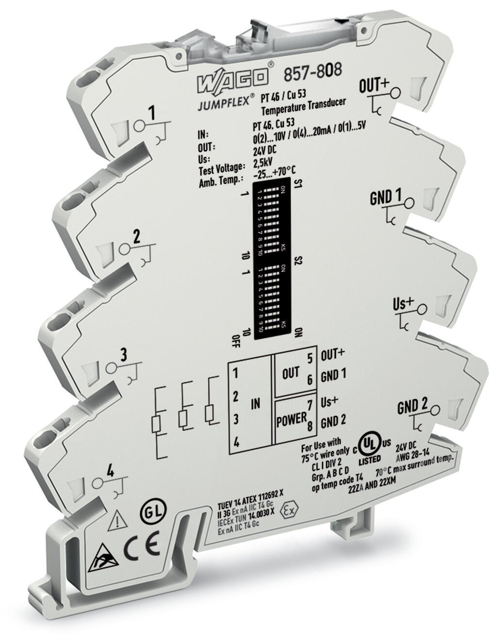 WAGO's temperature signal conditioner records signals from Pt46 and Cu53 sensors, converting a temperature signal into a standard analog signal at the output.
