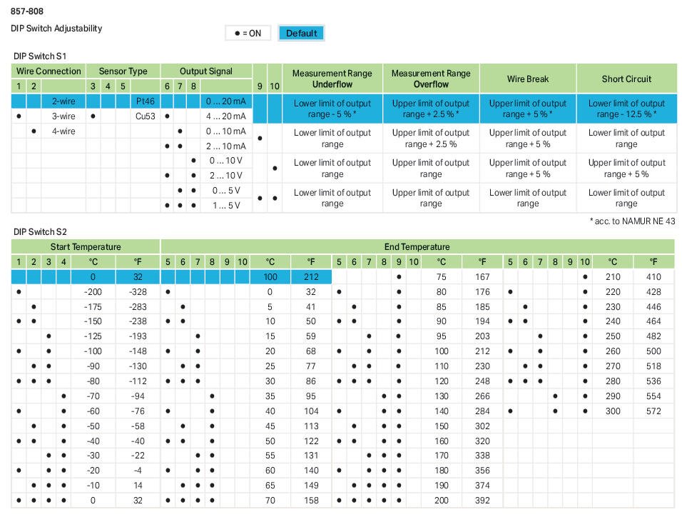 Temperature signal converters -200 up to +300°C (Pt46), 0 up to +180°C (Cu53). 857-808 WAGO