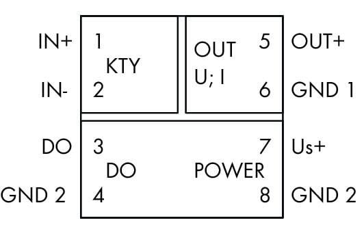 This temperature signal converter is suitable for KTY type sensors. It converts the temperature signal to a standard analog signal at its output.
