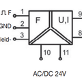 This module is used to convert a frequancy signal, with either sinusoidal or square waveform, into a standard analogue signal (eg. 0…10 V, 0..20 mA, 4…20 mA). A microprocessor provides a high resolution, high stability and accuracy output signal and a dip switch gives the possibility to select a calibrated range of frequency measurement from 0 … 100 Hz up to 0…28.8 kHz.