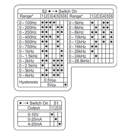 This module is used to convert a frequancy signal, with either sinusoidal or square waveform, into a standard analogue signal (eg. 0…10 V, 0..20 mA, 4…20 mA). A microprocessor provides a high resolution, high stability and accuracy output signal and a dip switch gives the possibility to select a calibrated range of frequency measurement from 0 … 100 Hz up to 0…28.8 kHz.