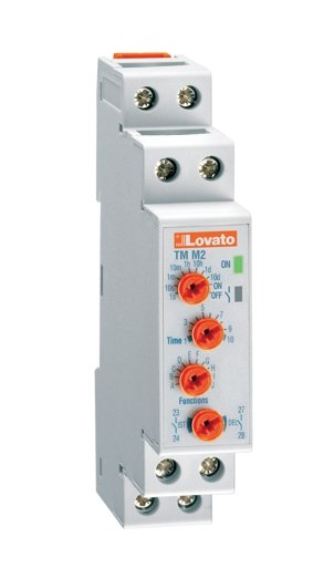 Multi-voltage interval (multi-function) timer with selectable time ranges ( 0.1 s - 10 days ), selectable timing functions, potentiometer for time adjustment and a relay output (NO+NC). The TM M2 multi-function timers are mounting on DINrail and have housing 17.5 mm wide, suitable both for back and front panel mounting.