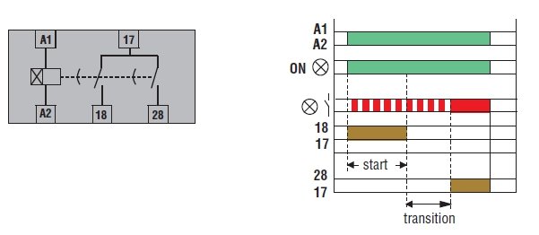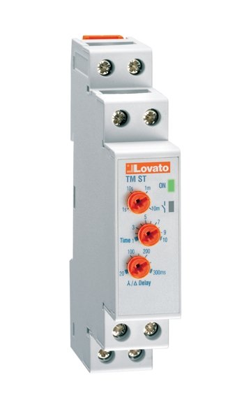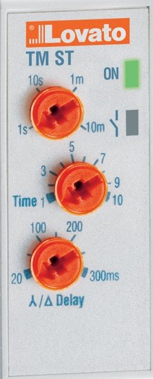 Multi-voltage Start-Delta timers with selectable time ranges ( 0.1 s - 10 min ), output relay with neutral position (1 x NO+NC), potentiometer for time adjustment and potentiometer for time transition between Y and Δ . The TM ST timers are mounting on DIN-rail and have housing 17.5 mm wide, suitable both for back and front panel mounting.