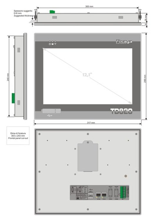 - TD820-AD: HMI 12.1" integrating soft-plc + 1 RS485 + 1 CANopen + 1 Ethernet + Movicon CE Lite