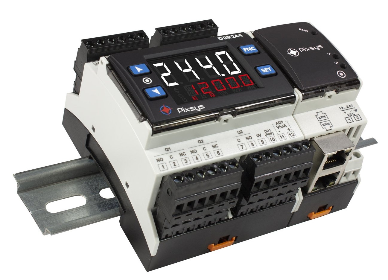PID controller-converter, for DIN rail. Input: 1 dig+1 analog. Outputs: 3 relays+2 SSR+1 analog+2 auxiliary. PIXSYS