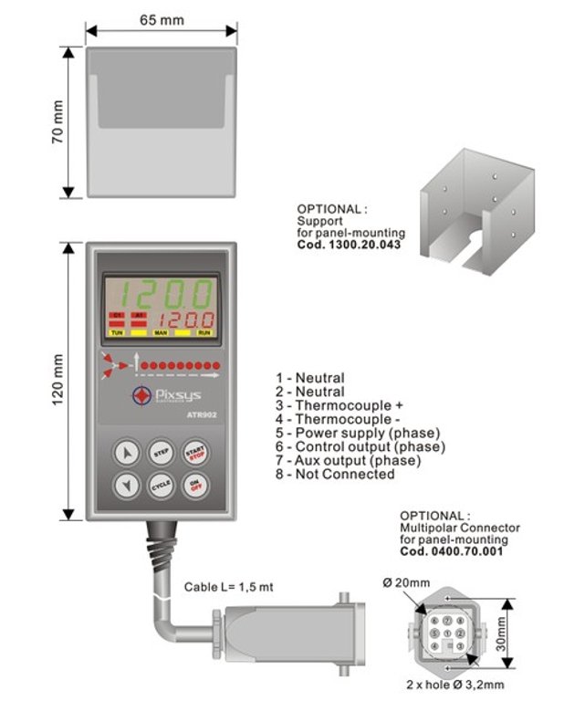 Specifically designed for the automation of hobby and professional kilns for ceramics, glass or laboratory applications that require the programming of cycles/curves with temperature in relation to time. Software functions for Delayed start, Step end wait (in the case of delay of the process on the programmed setpoint value) and Cycle recovery mode (following a power cut-off). The multi-pole connector compatible with the ATR900/901 series does not require wiring and offers immediate connection/installation.