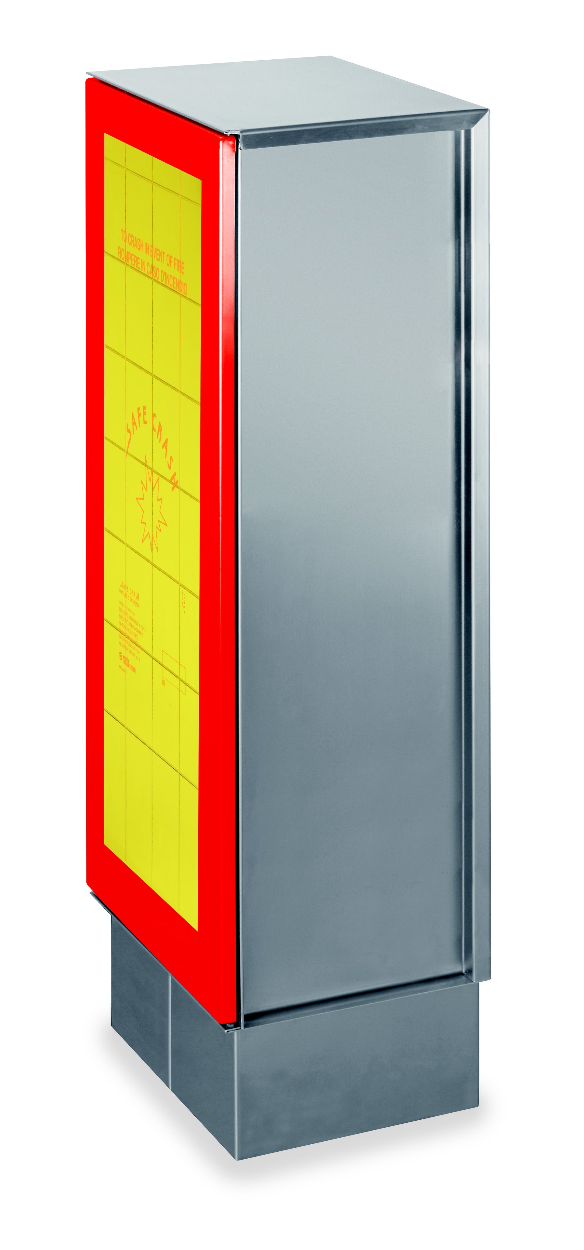 Characteristics: 20m “gomel” fire hose, 45mm diameter. AWG UNI45 nozzle with 3 effects complete with1”1/2 UNI45 brass tap. Flat breakable glass with “SAFE CRASH” patent. The cabinet is supplied with 9W-230V fluorescent lighting, red diffuser and G23 lampholder. Suitable for fastening onto concrete using max. M10 threaded pins (not included).