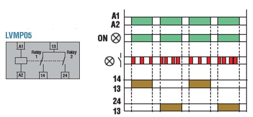 Α small (1 DIN) useful device to optimize the operating time and therefore the wear of motors (pumps, compressors, etc.) when two units - primary and standby - are installed. The LVM P05 works in a very simple way. At power-up, it closes one of the two available NO contacts; at power-down this contact opens. At the next power-up, it will close the contact that was open at the previous one. To identify which output relay is energized, there are two different LED flashing rates.
