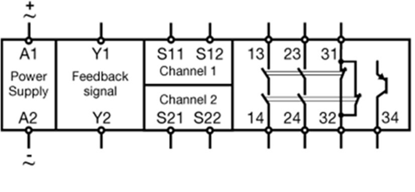 The SM2H21 safety module is designed in Category 4, Performance Level e in accordance with the Machine Directive EN ISO 13849-1 to monitor and control safely the operation of two hand control consoles (Type III C according to EN 574-1).