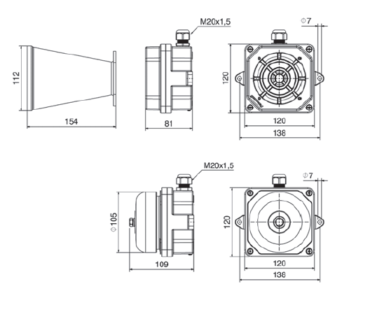 Sirens and bells in aluminium alloy for continuous operation, suitable for applications in explosion hazardous areas as defined in ATEX Directive 2014/34/EU.