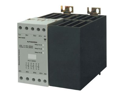 RJT3A: Solid state relay with THREE independently control inputs, THREE independently switched poles and integral heatsink, ready to mount on DIN-rail or chassis.