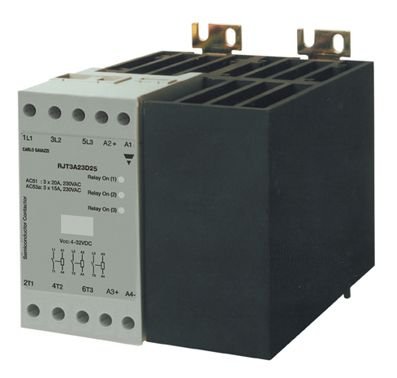 RJT3A: Solid state relay with THREE independently control inputs, THREE independently switched poles and integral heatsink, ready to mount on DIN-rail or chassis.