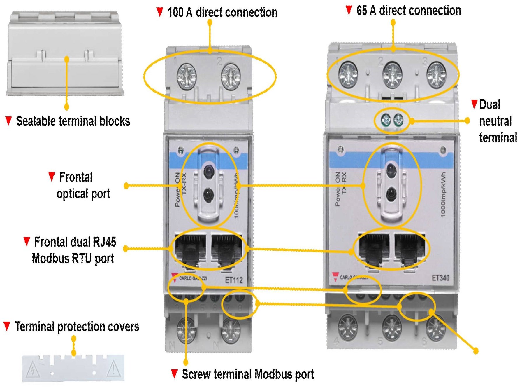 The ET340.. housing is for DIN-rail mounting and is provided with RS485 Modbus port available through screw terminals, dual RJ45 connectors or optical infrared communication port for maximum 247 transceivers on the same bus. Also a run-hour meter is available to link the energy to the relevant working hours.