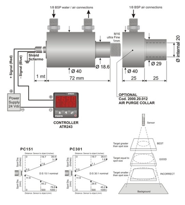- 2000.20.025 (PC301..): 0-500°C, sensor spot 30:1 out 4...20mA with air/water cooled housing