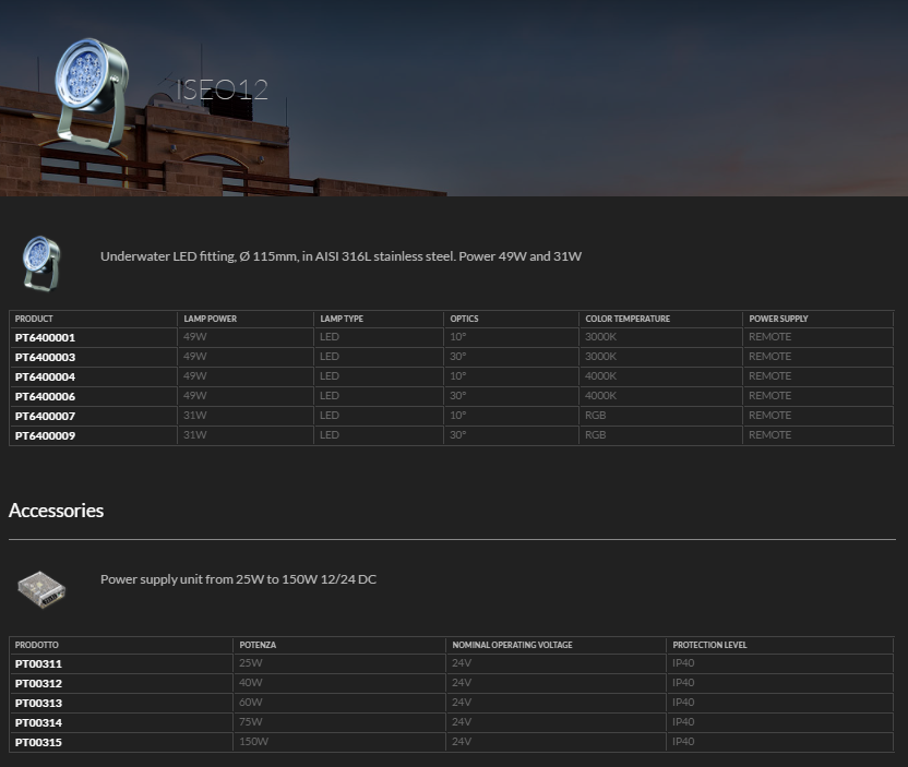 Submersion LED lighting fixture realized in AISI 316L stainless steel. Top IP grade to be installed in fountains or swimming pools or in places with a high risk of corrosion. The RGB version allows diverse color effects.